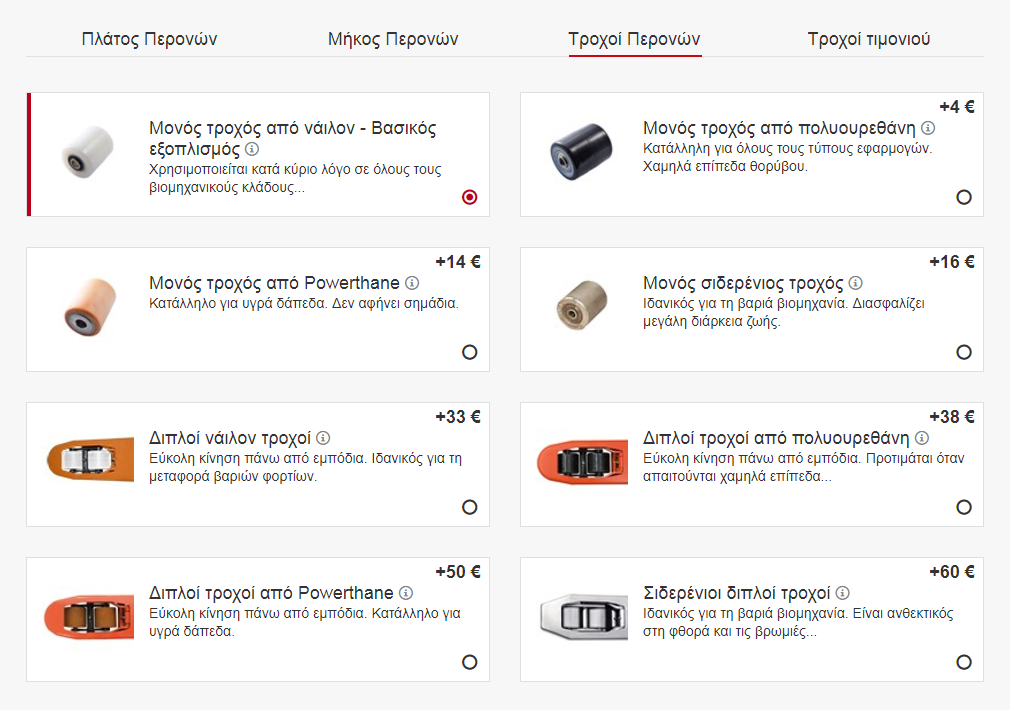 Ελέγξτε τα στοιχεία του προϊόντος, τις εικόνες, τις προδιαγραφές, τα βίντεο και τις λειτουργίες του. Για να βεβαιωθείτε ότι το ανυψωτικό μηχάνημα ταιριάζει στη επιχείρησή σας, μπορείτε να το προσαρμόσετε διαλέγοντας από τις επιλογές και πρόσθετα χαρακτηριστικά (add-ons) που προσφέρουμε, όπως για παράδειγμα ρόδες, πιρούνια, τύποι ιστών κ.λπ.